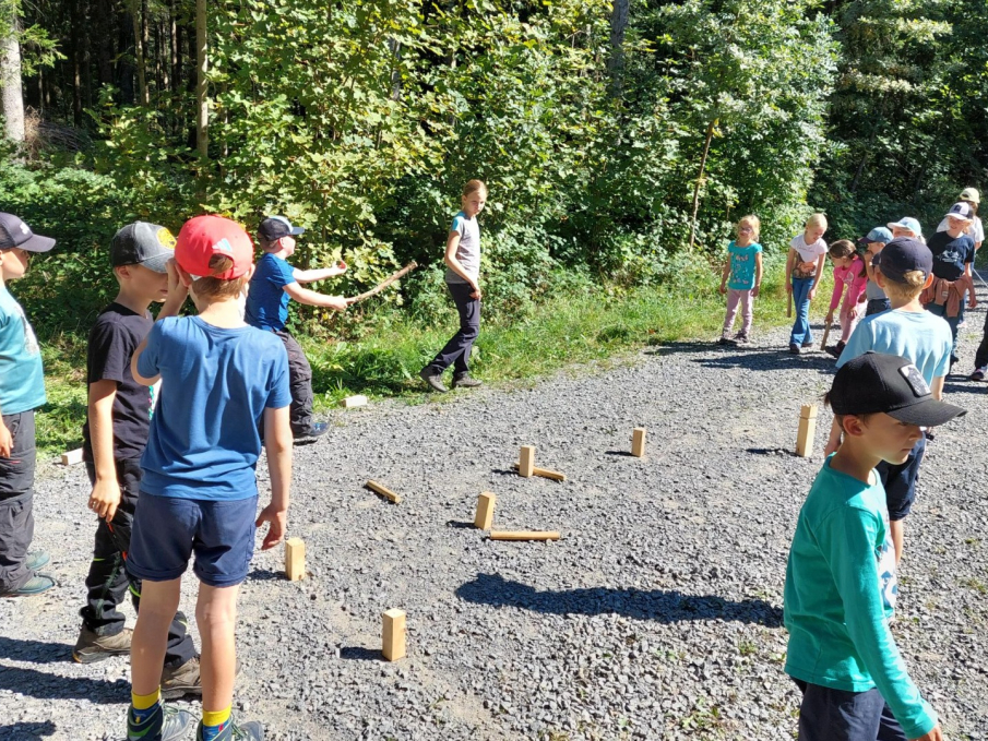 In einem Sternmarsch liefen die einzelnen Klassen auf verschiedenen Routen zum Picknickplatz im Ämmewilerwald. Dort konnten alle ausgiebig spielen, sich im Wald austoben, in bunt gemischten Gruppen Kubb spielen und die eingepackten Köstlichkeiten geniessen.